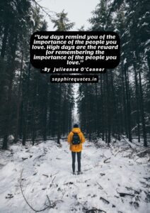 77)  ”Low days remind you of the importance of the people you love. High days are the reward for remembering the importance of the people you love.”  -Julieanne O’Connor