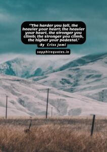 06)  ”The harder you fall, the heavier your heart; the heavier your heart, the stronger you climb; the stronger you climb, the higher your pedestal.”  -Criss Jami