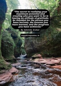 38) ”The secret to realizing your maximum potential and creating who you want to be is having an attitude of gratitude. Be thankful for the person you have become, the lessons you have learned, and the progress you have achieved.”