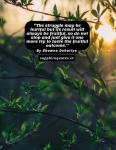 71)  ”The struggle may be hurtful but its result will always be fruitful, so do not stop and just give it one more try to taste the fruitful outcome.”  -Bhawna Dehariya