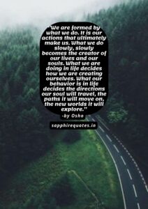 82) ”We are formed by what we do. It is our actions that ultimately make us. What we do slowly, slowly becomes the creator of our lives and our souls. What we are doing in life decides how we are creating ourselves. What our behavior is in life decides the directions our soul will travel, the paths it will move on, the new worlds it will explore.” -OSHO