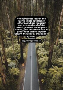56) ”The greatest fear in the world is the opinion of others, and the moment you are unafraid of the crowd, you are no longer a sheep, you become a lion. A great roar arises in your heart, the roar of freedom.” -OSHO